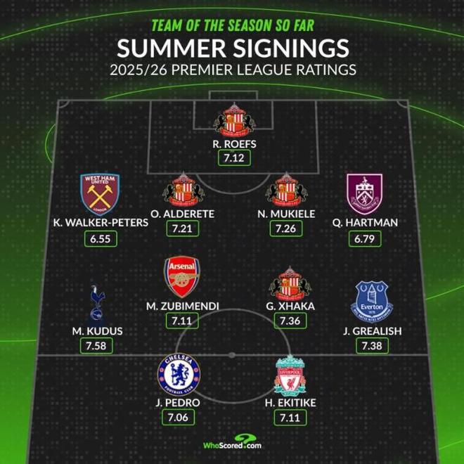 英超7轮战罢,WhoScored评出了由今夏新援组成的最佳11人阵容,四名桑德兰球员入选(数据为联赛数据)。